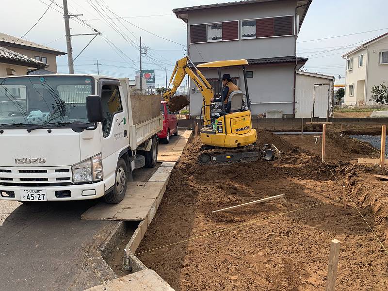 こちらは、牛久市W様邸の様子です。安藤さんが土をダンプに載せています。